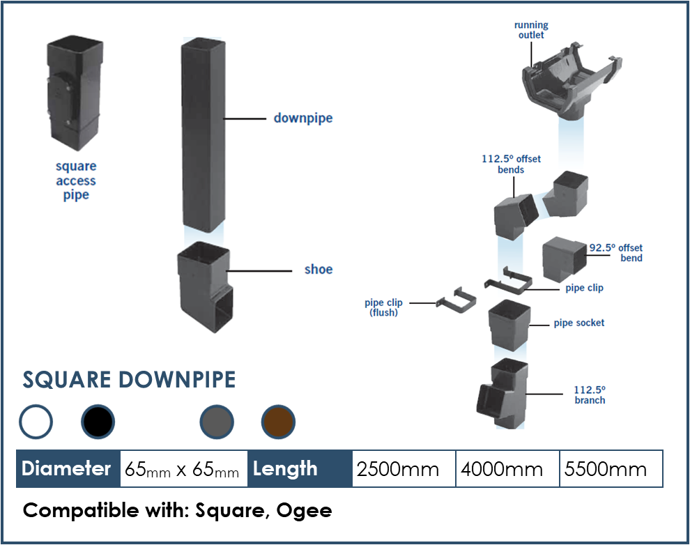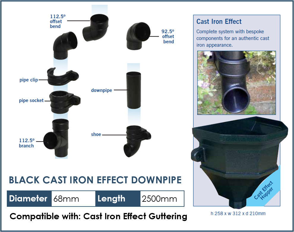 Suitable for all types of buildings including domestic, commercial and industrial. They are tough and durable, yet lightweight for easy installation. Well defined, stylish contours ensure a seamless match with the architecture of all properties, old or new. High gloss blemish free surfaces, providing excellent all round weathering and colour fastness.